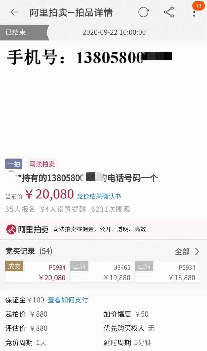 日前,该手机号码以880元为起拍价,在淘宝司法拍卖平台上架,35人参与竞拍,手机号码最终以2万元成交,买受人按期支付了全部拍卖款项!