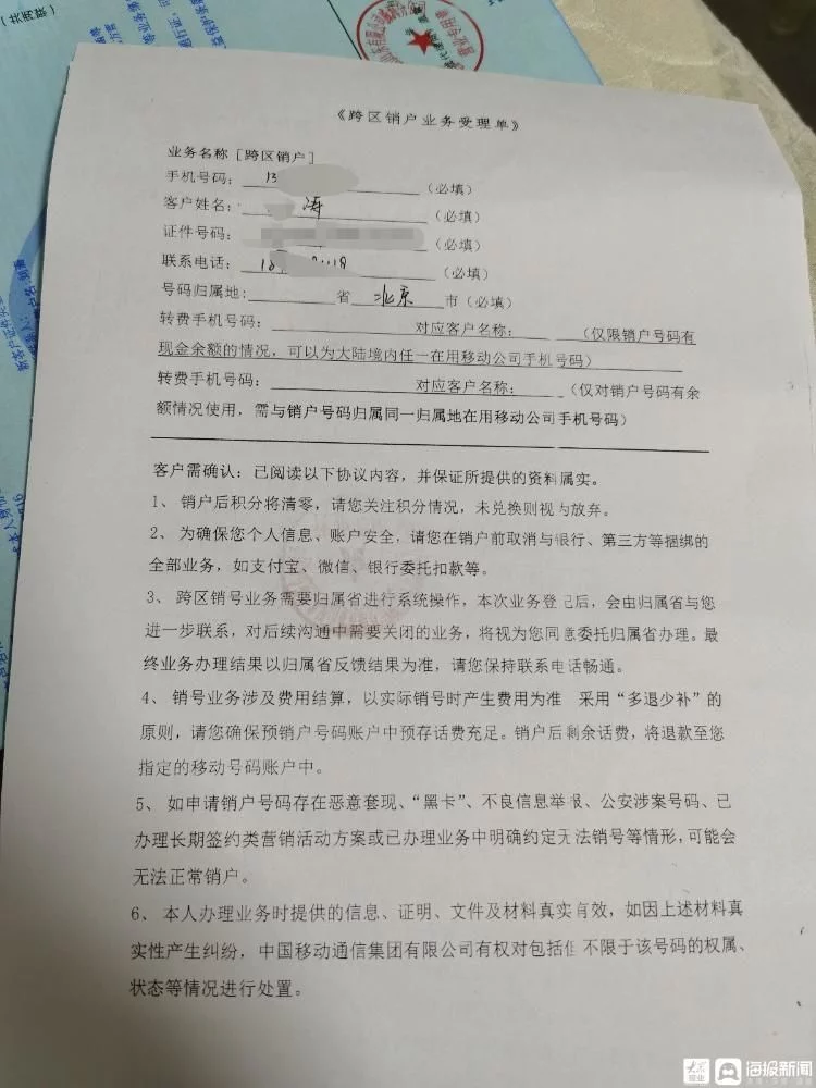 图说:高涛在当地营业厅签署的《跨区销户业务受理单》,并委托北京移动办理相关业务。